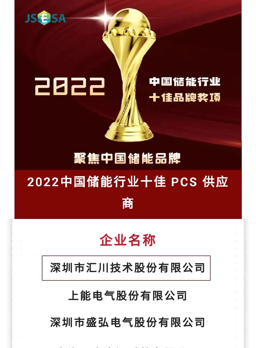 不久后,由中國(江蘇)國際儲能大會組委會與江蘇省儲能行業(yè)協(xié)會主辦的“2022中國儲能行業(yè)十佳品牌”系列獎項公益評選活動中,匯川技術(shù)在數(shù)百家企業(yè)海選中脫穎而出,成功入圍“2022中國儲能行業(yè)十佳PCS供應(yīng)商”。接連斬獲儲能最佳供應(yīng)商獎項,不僅是對匯川技術(shù)研發(fā)創(chuàng)新的肯定,也是對匯川技術(shù)綜合實力的認可。